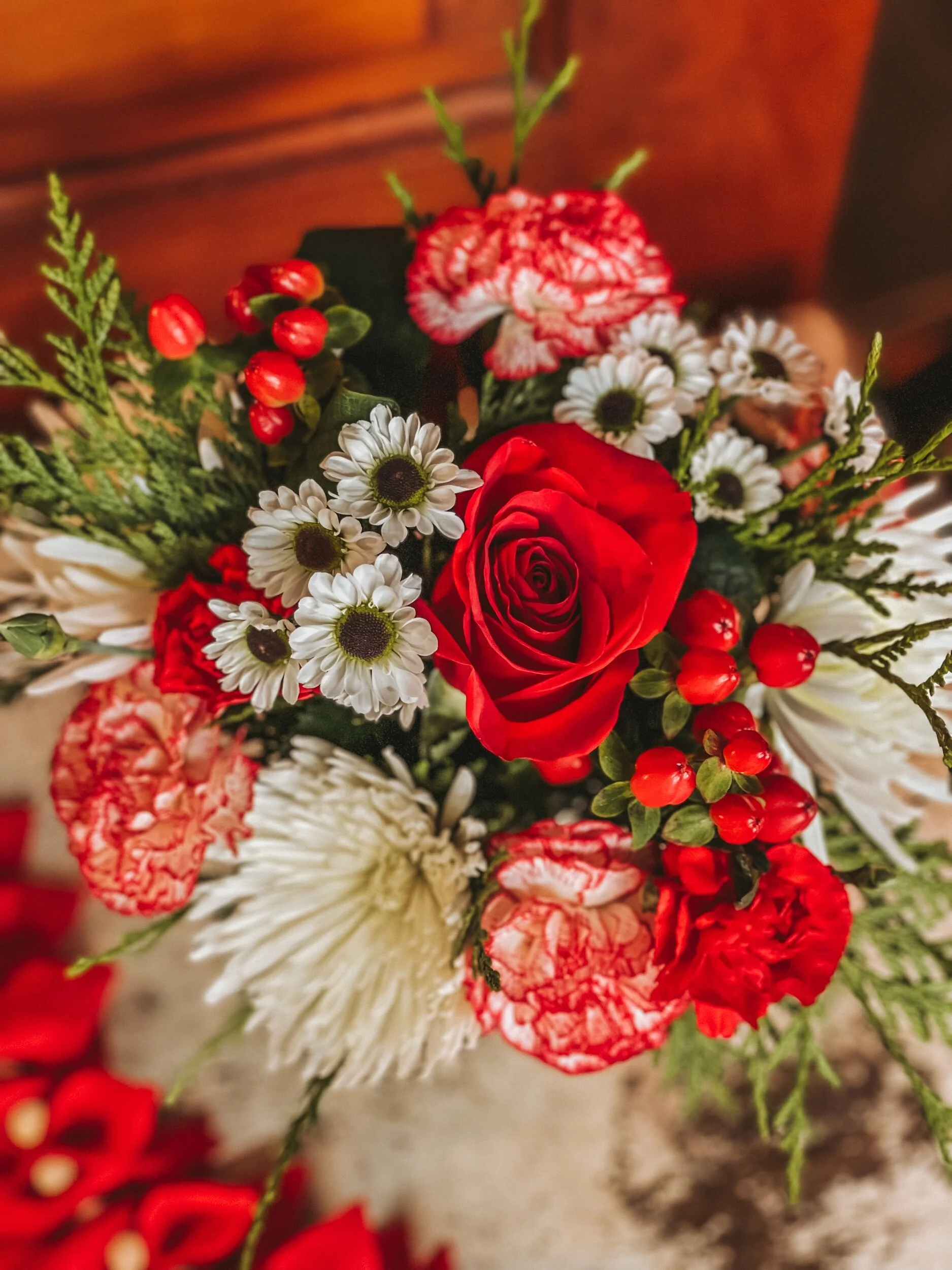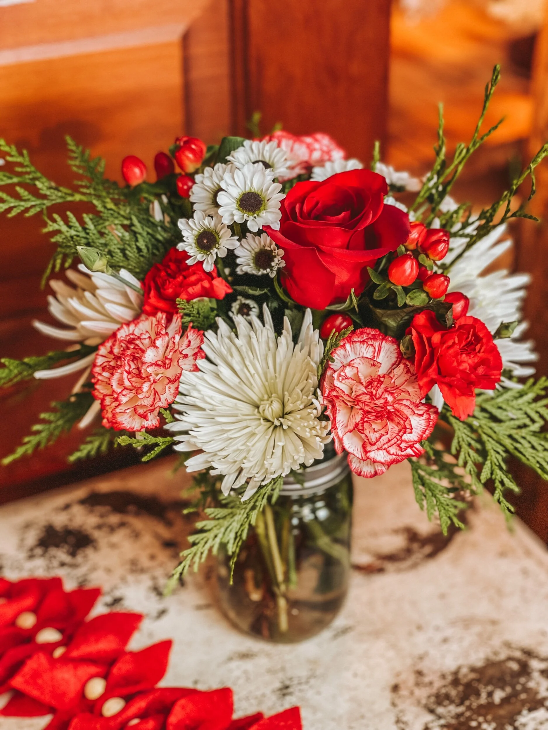 Fresh cut arrangement with a mixture of seasonal colors and evergreens. Some substitutions may apply depending on product availability that week. We will make bouquet as similar to the picture shown.