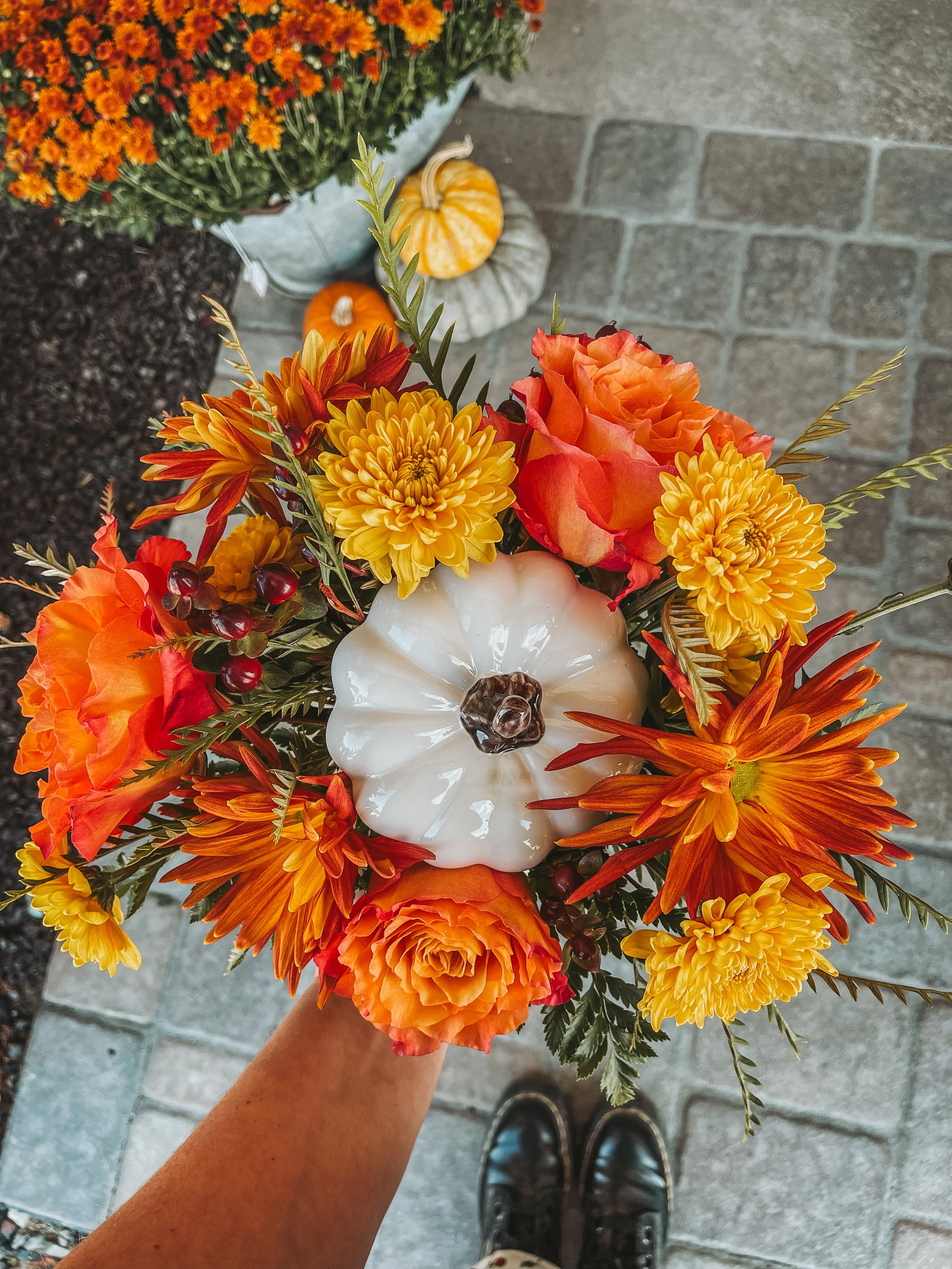 Flowers & Gifts › Hello Pumpkin Image 1 of 2 Image 2 of 2 Hello Pumpkin $48.99 Fall floral arrangement in pumpkin shaped container. Some substitutions may apply to flowers. Quantity: Add To Cart Added! Fall floral arrangement in pumpkin shaped container. Some substitutions may apply to flowers.