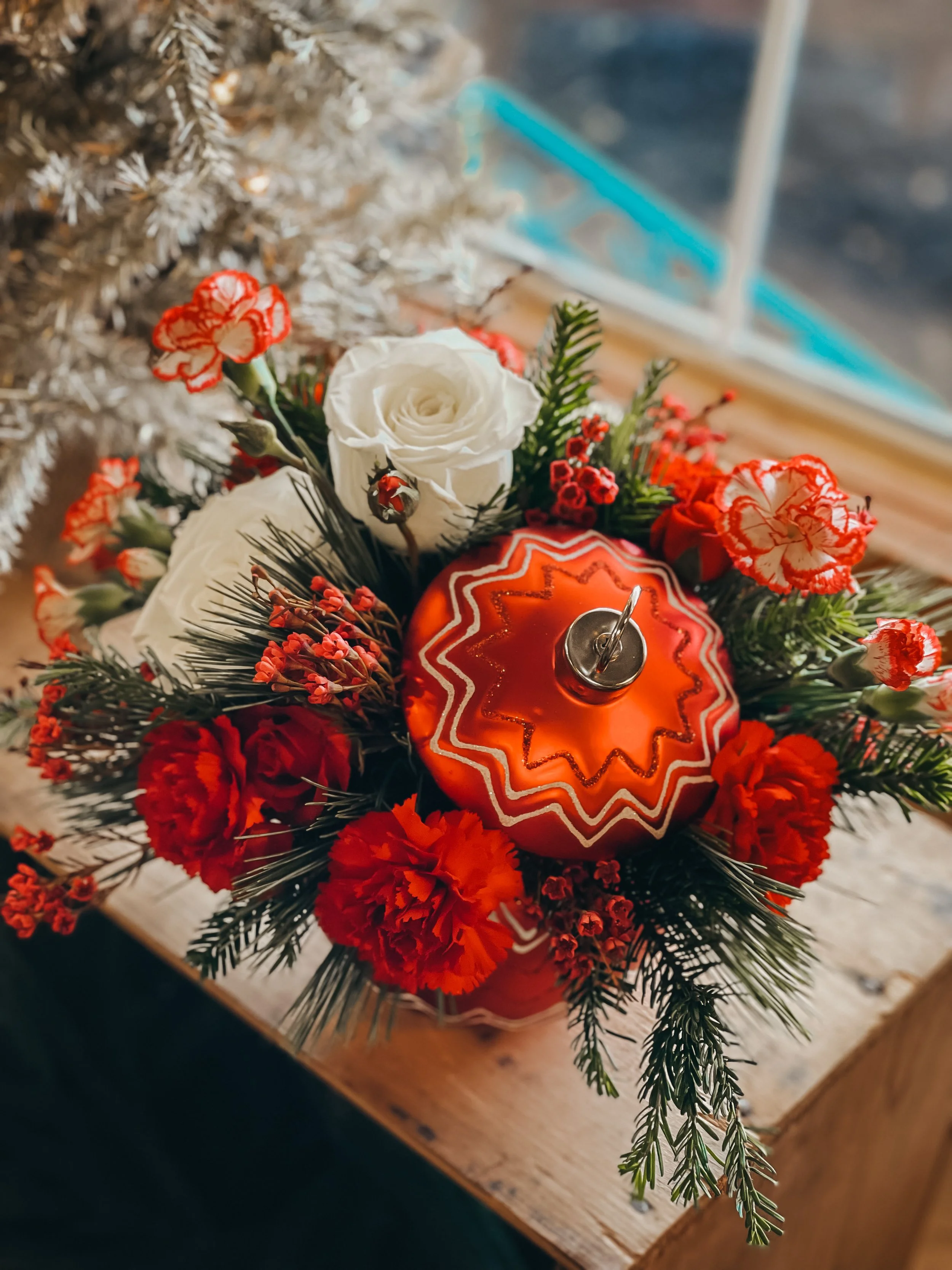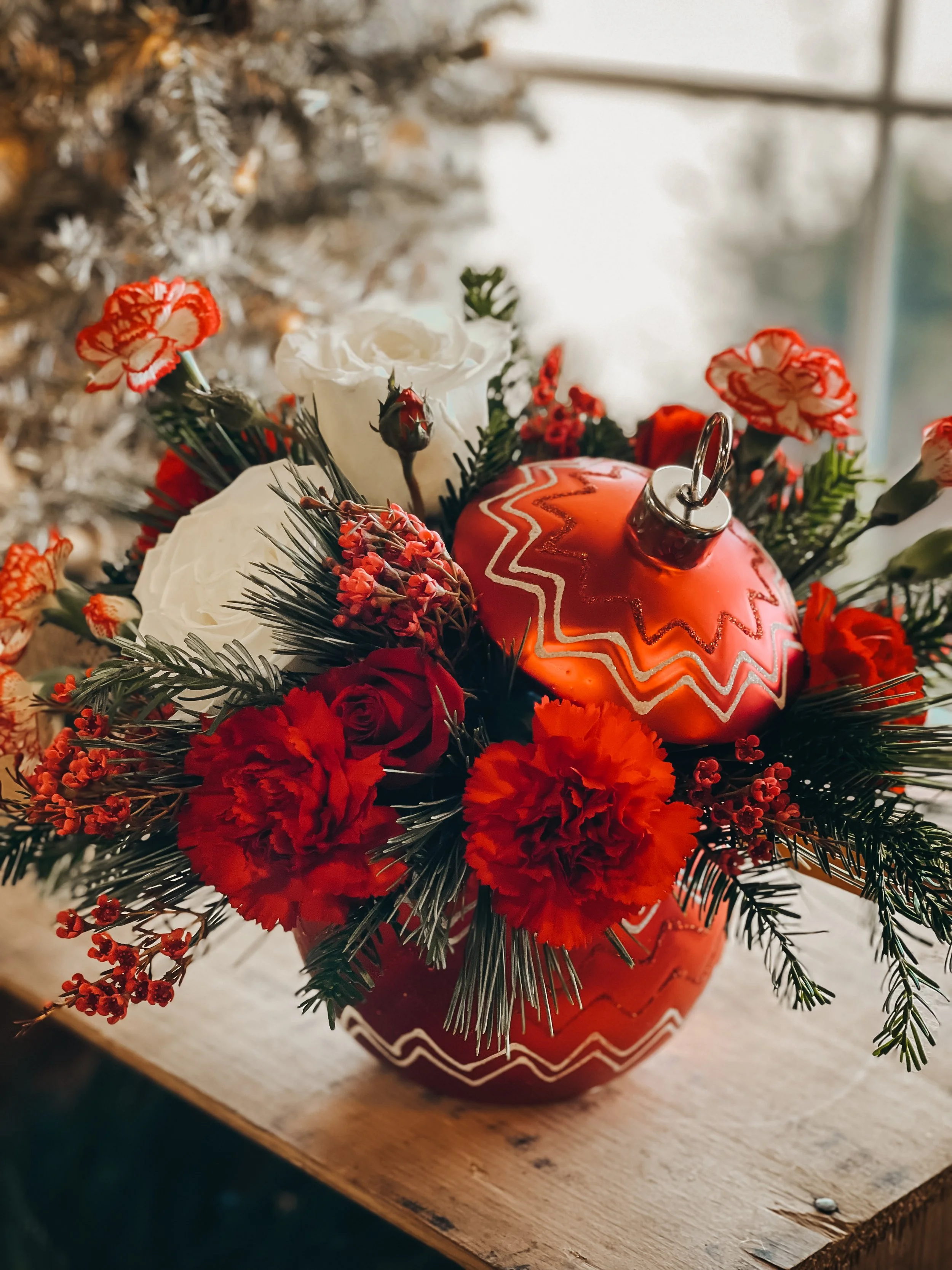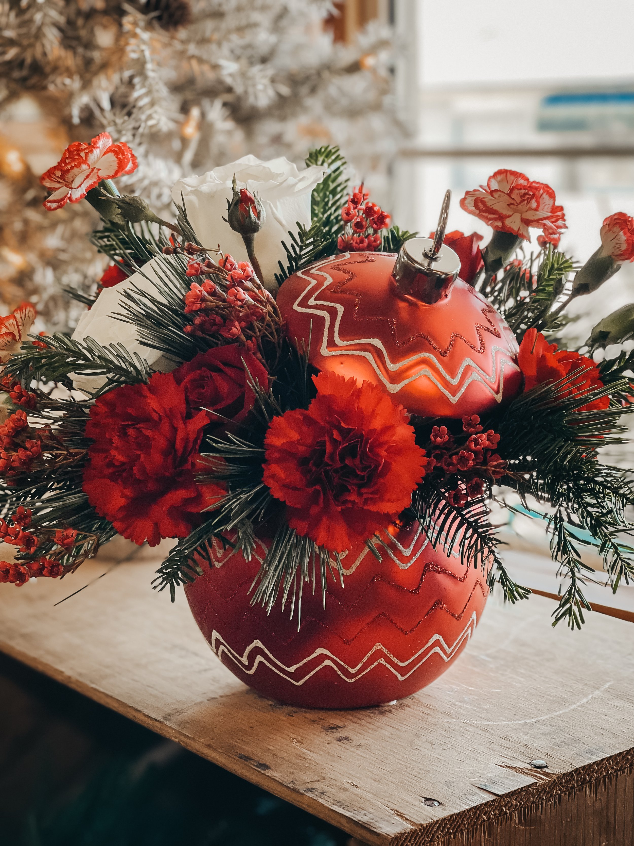 Fresh cut arrangement with a mixture of seasonal colors and evergreens in an ornament container. Some substitutions may apply depending on product availability that week. We will make arrangements as similar to the picture shown.