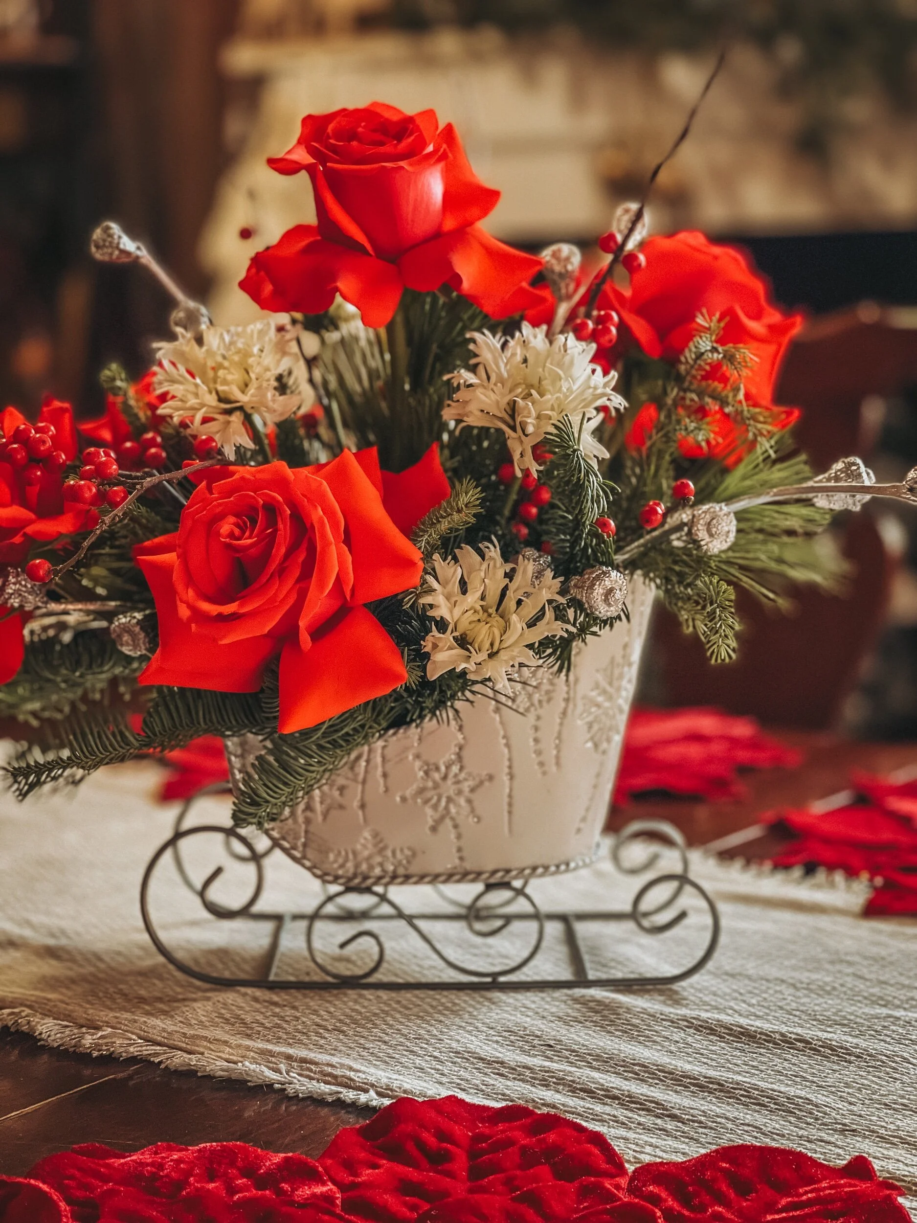 Seasonal fresh cut arrangement with holiday colored florals and fresh evergreens. Arranged in a decorative sleigh tin container. As shown in pictures. Some substitutions may apply.