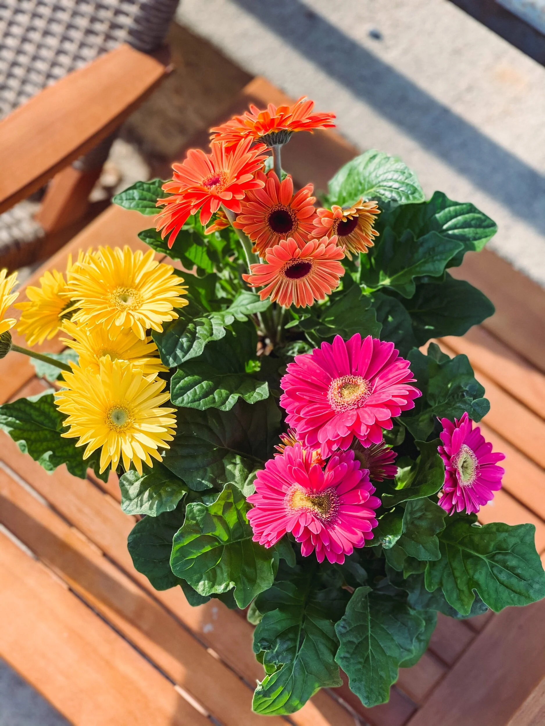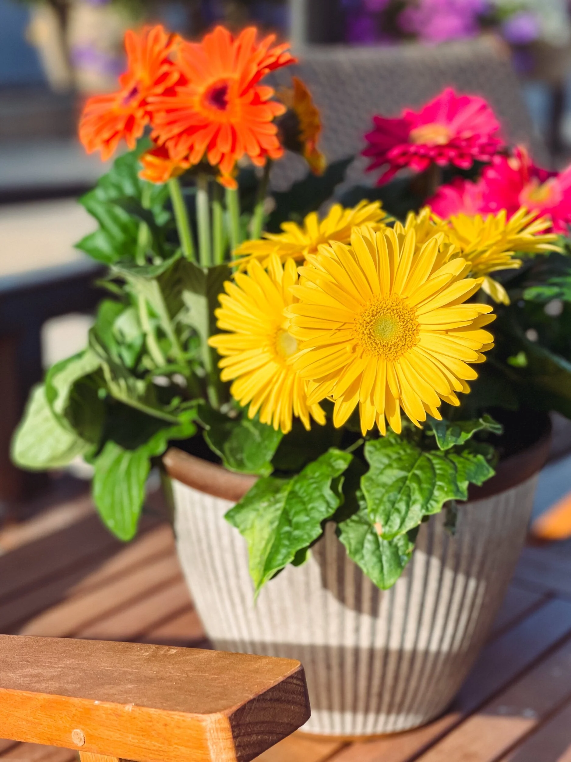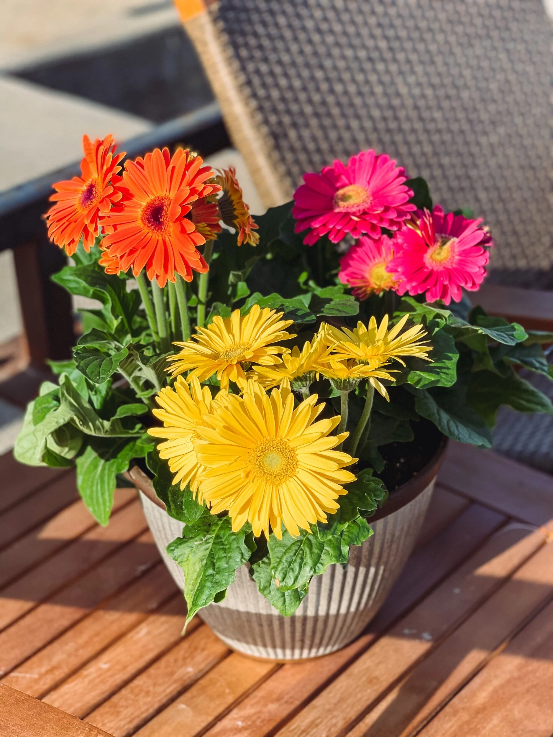 Brighten the day with this Gerber Daisy pot. Ready to delivery and enjoy all summer long.