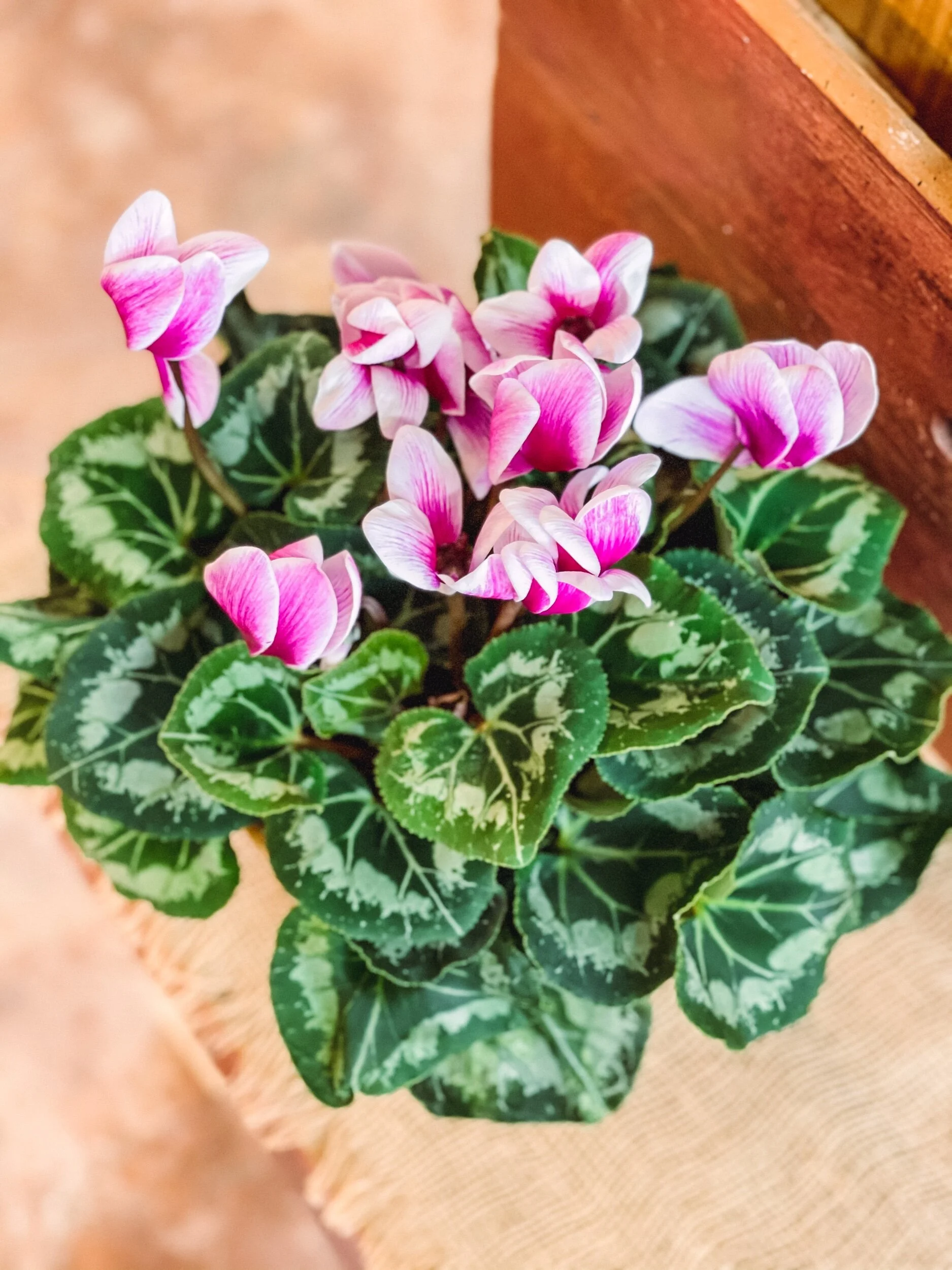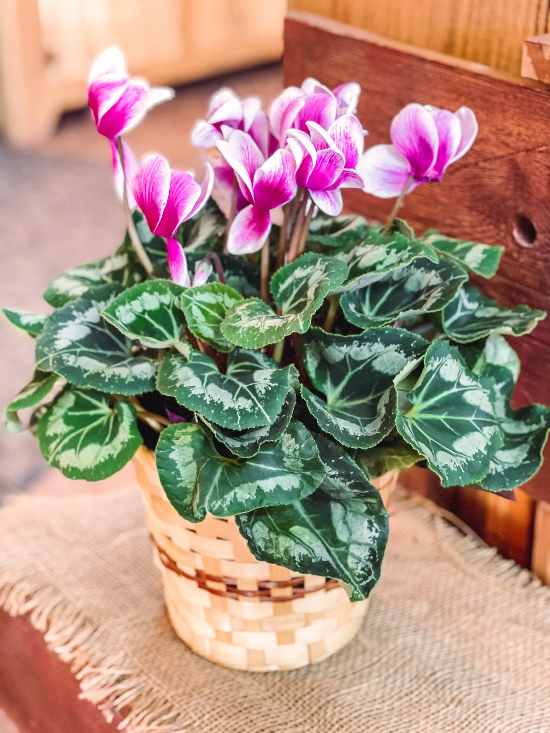 Plants › Cyclamen with Basket Image 1 of 2 Image 2 of 2 Cyclamen with Basket $44.99 One 6” cyclamen blooming plant in wicker basket. Basket is lined with plastic making watering mess free. Add To Cart Added! One 6” cyclamen blooming plant in wicker basket. Basket is lined with plastic making watering mess free.