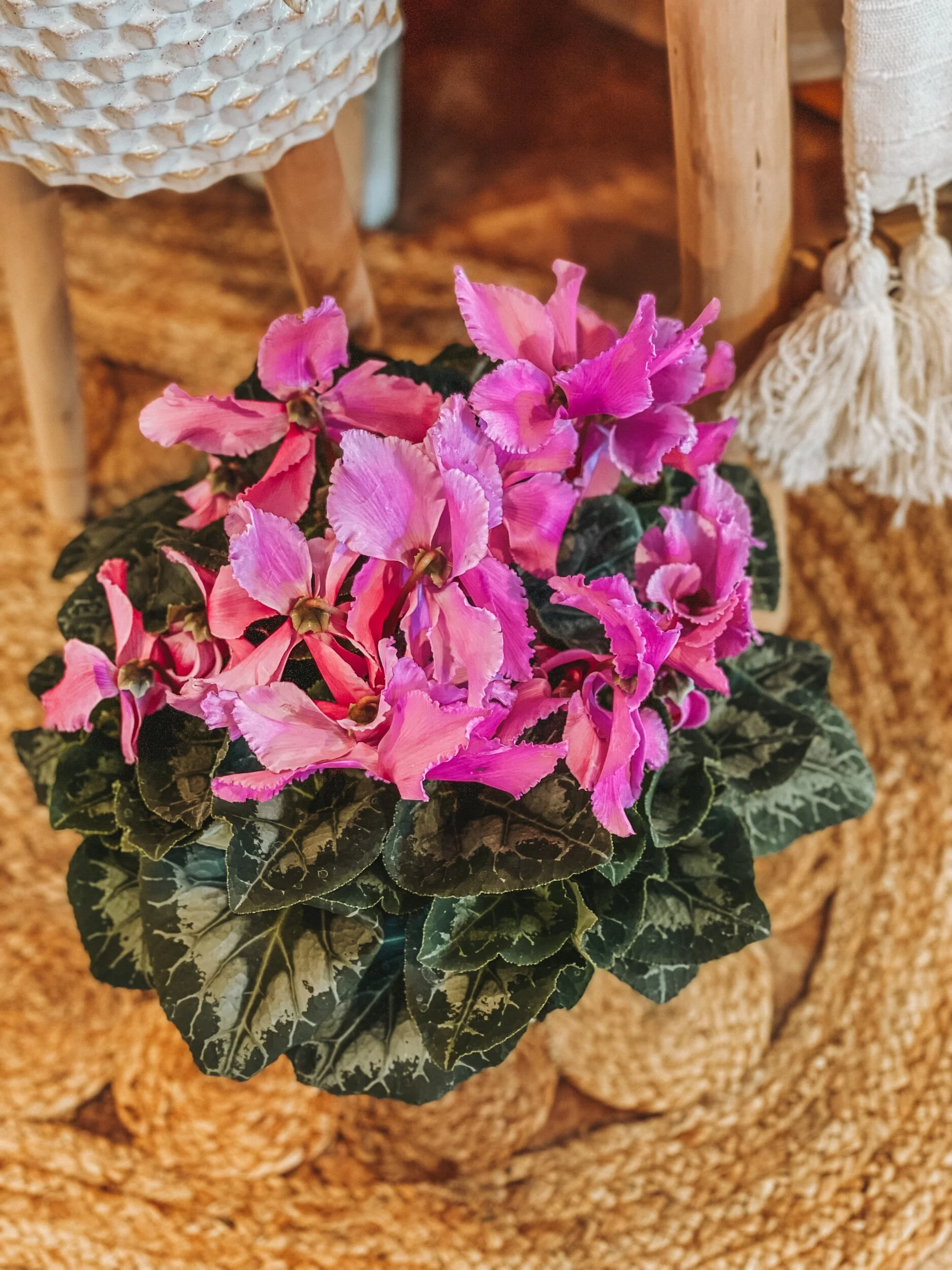 Colorful cyclamen plant paired with a rustic metal pot cover, as shown in pictures.