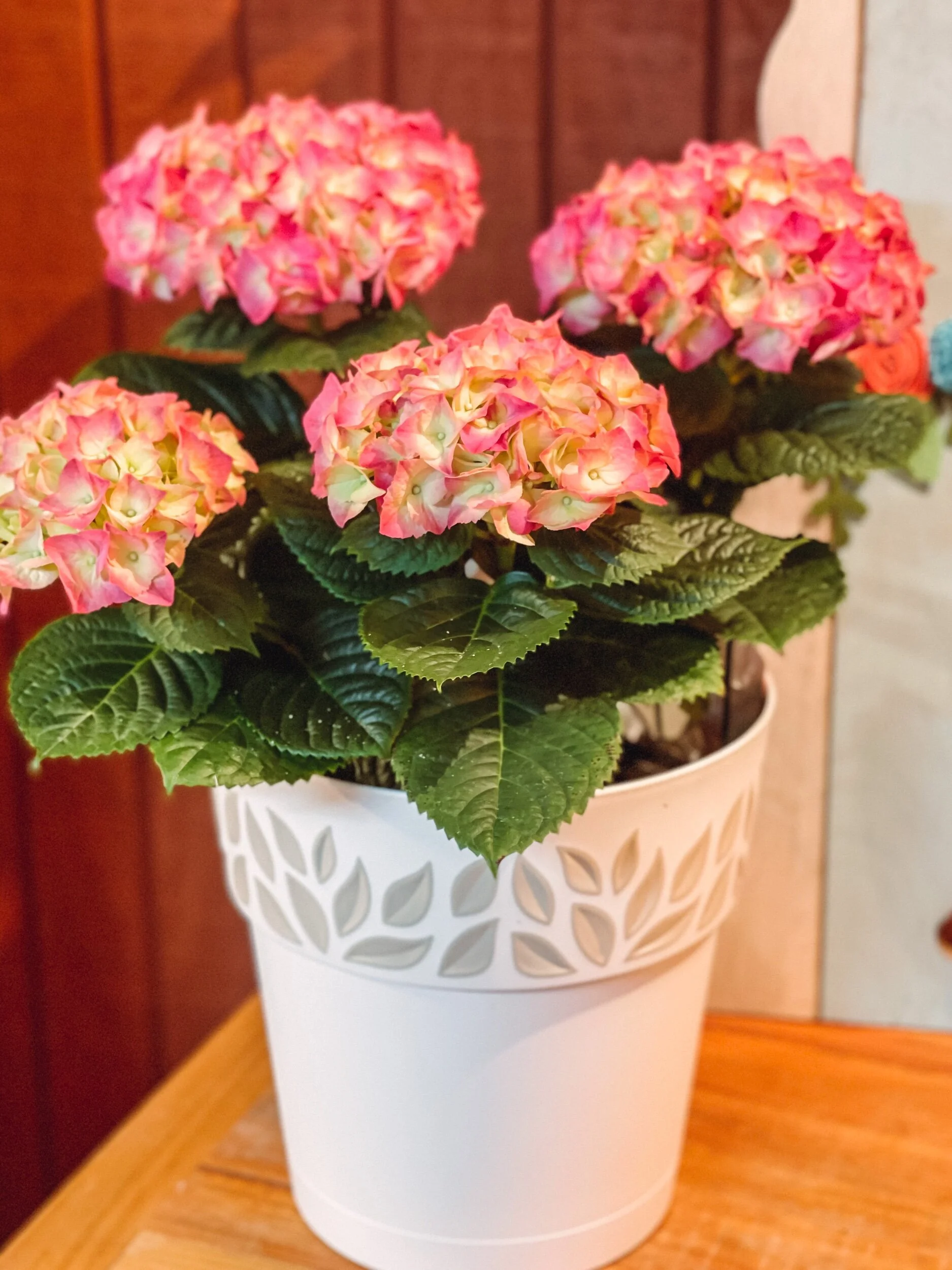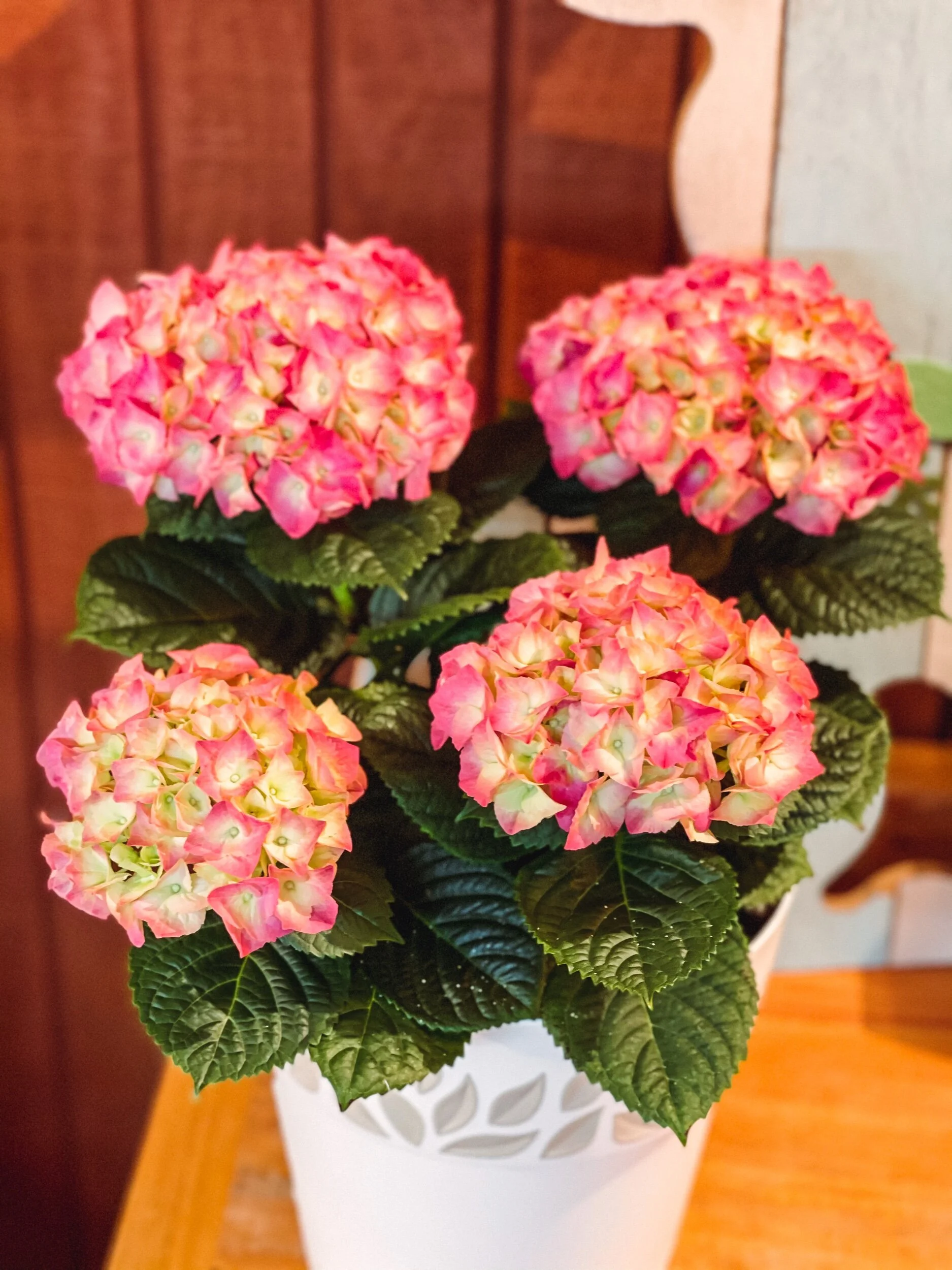 Hydrangea plant with hard plastic cover pot with drainage. Price includes plant and pot cover. As shown in pictures.