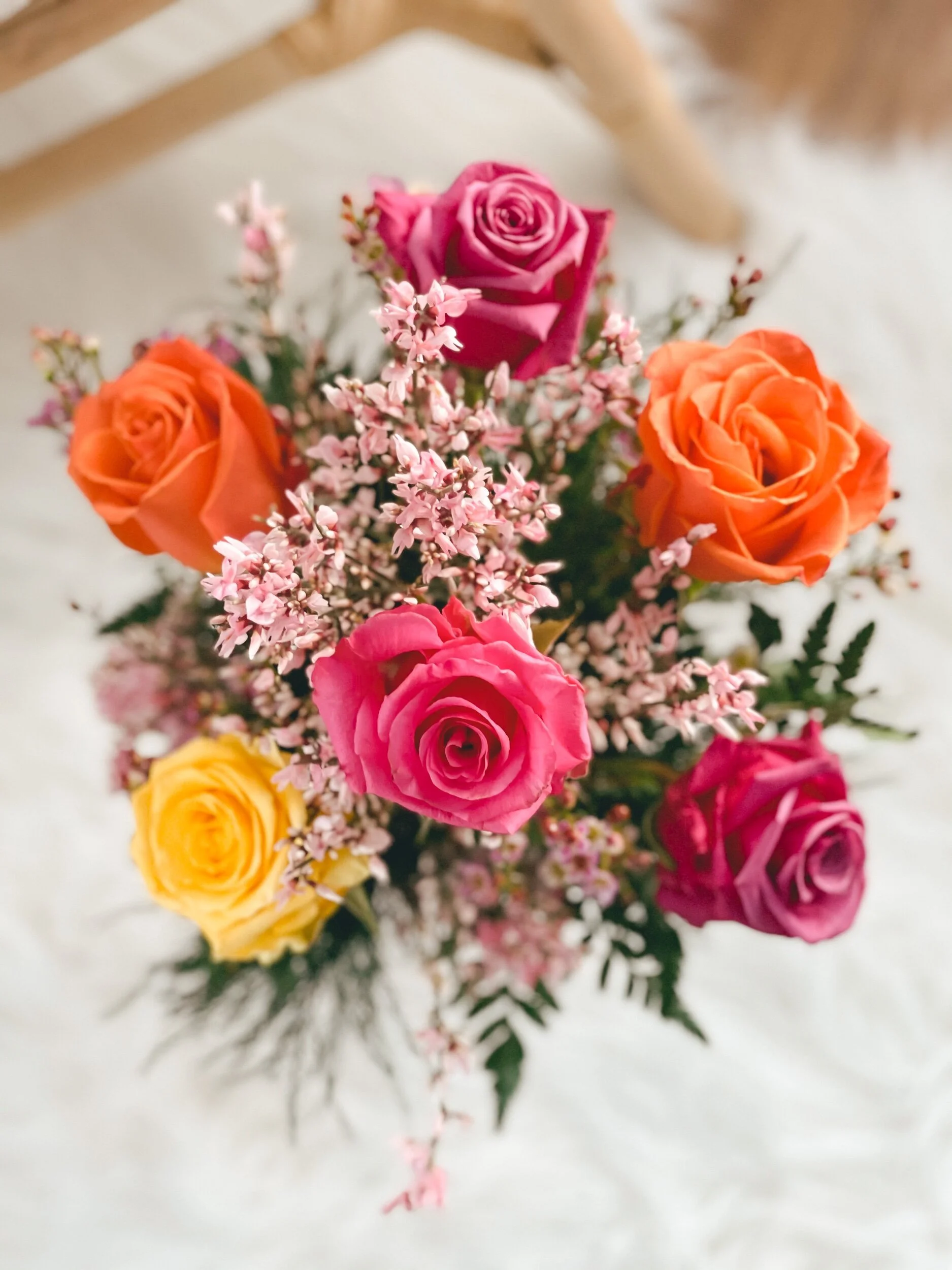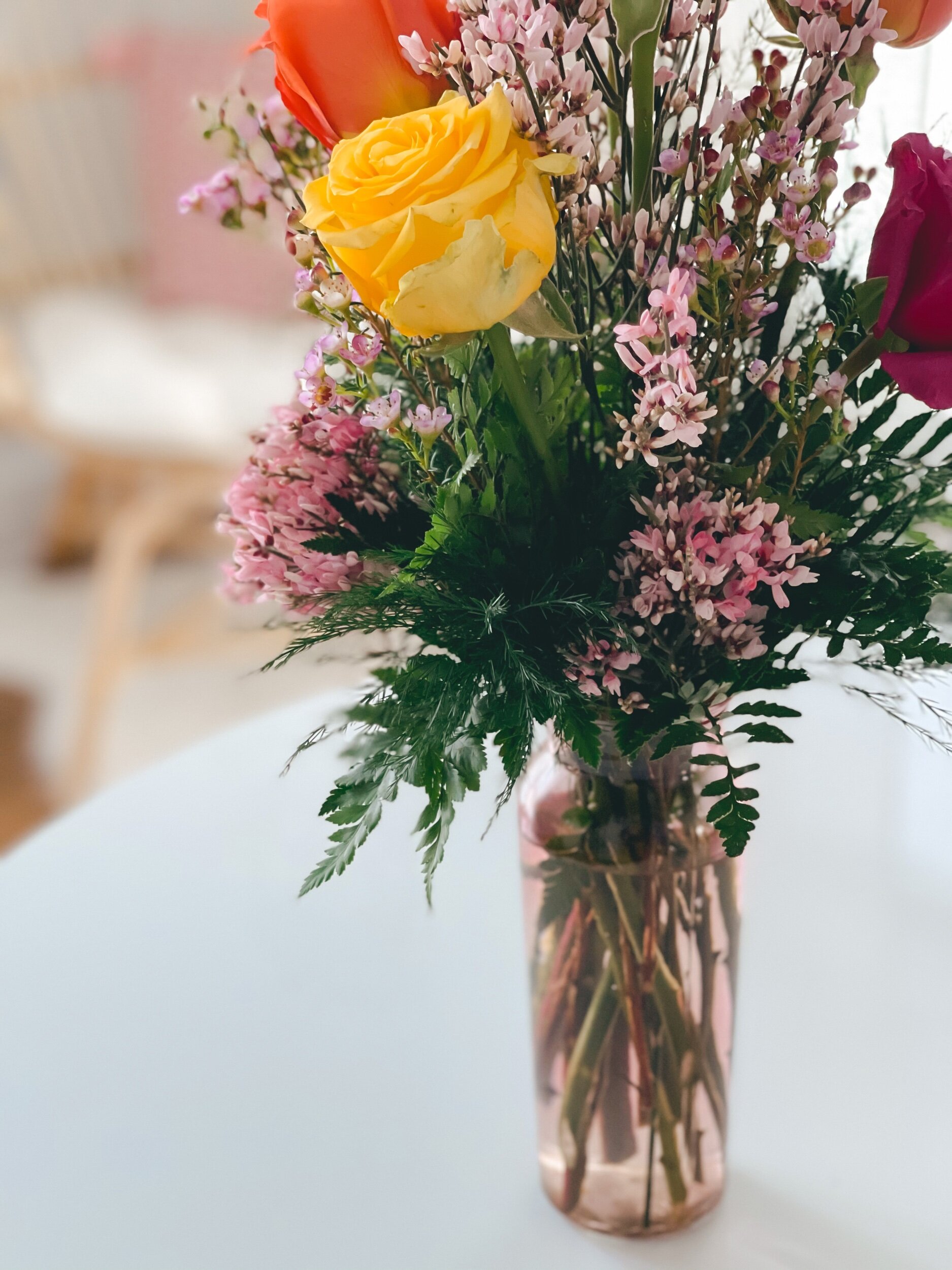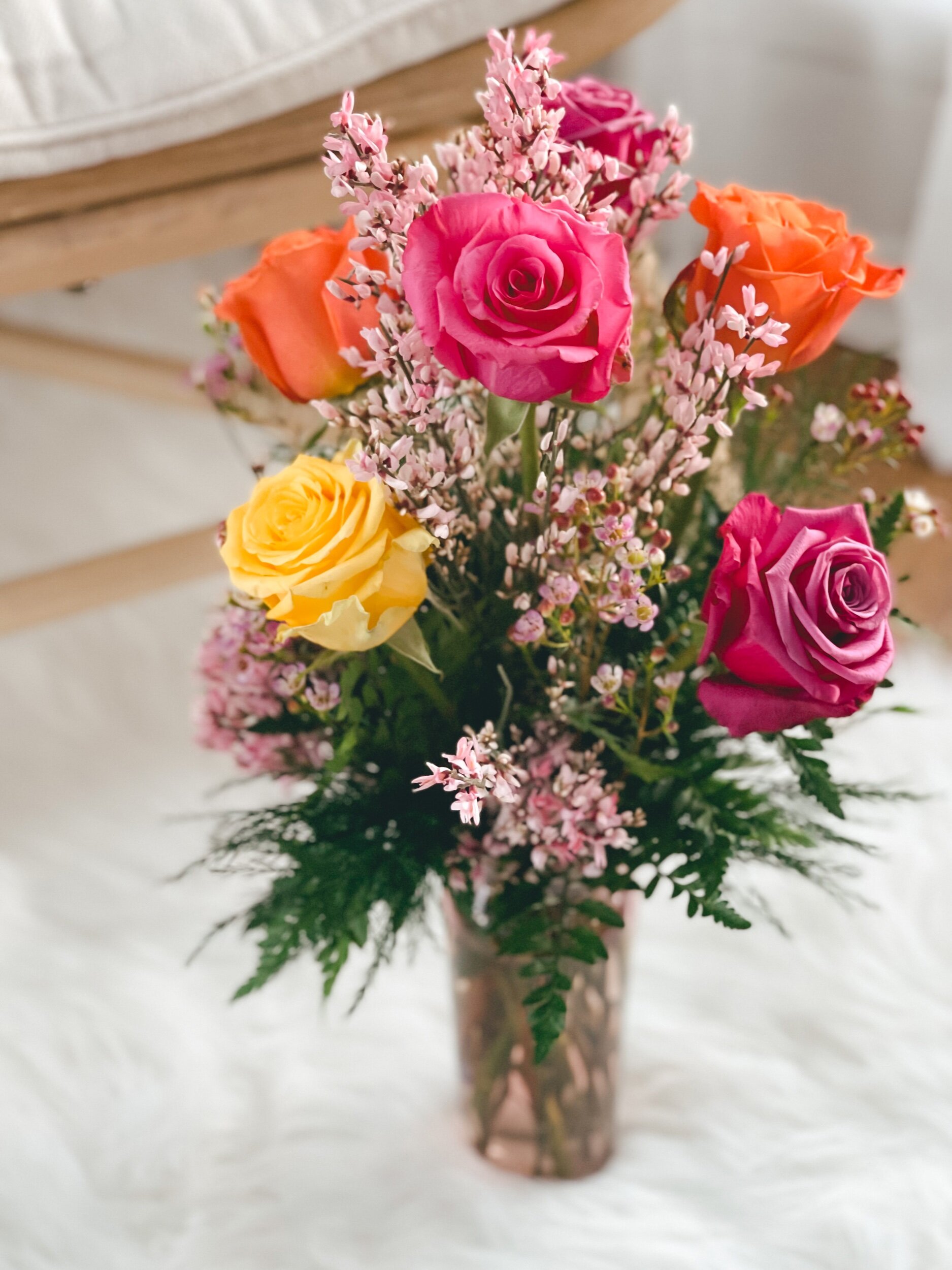 Half dozen assorted colored roses arranged in a colored vase with greenery and filler flowers.