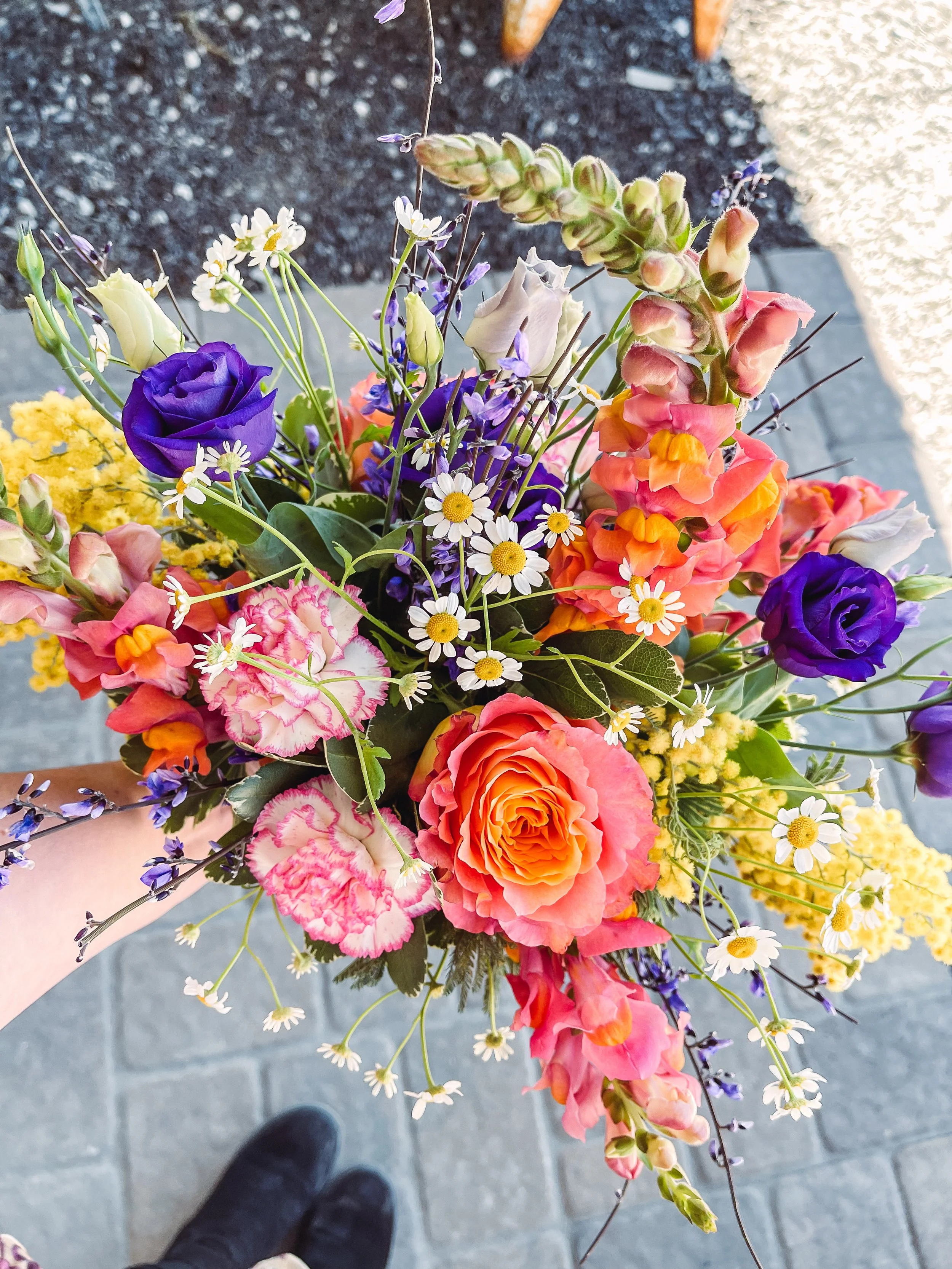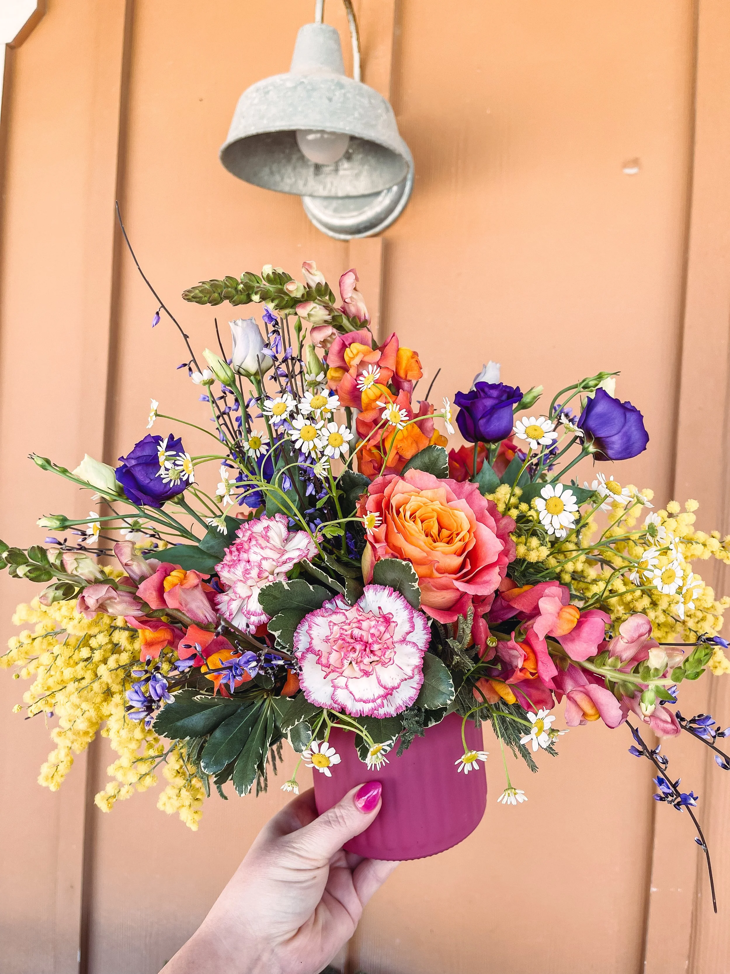 A fun and vibrant assortment of florals in colored vase. Will make the arrangement as close to pictured as possible, but some substitutions may apply to flowers or vase depending on product available that week.