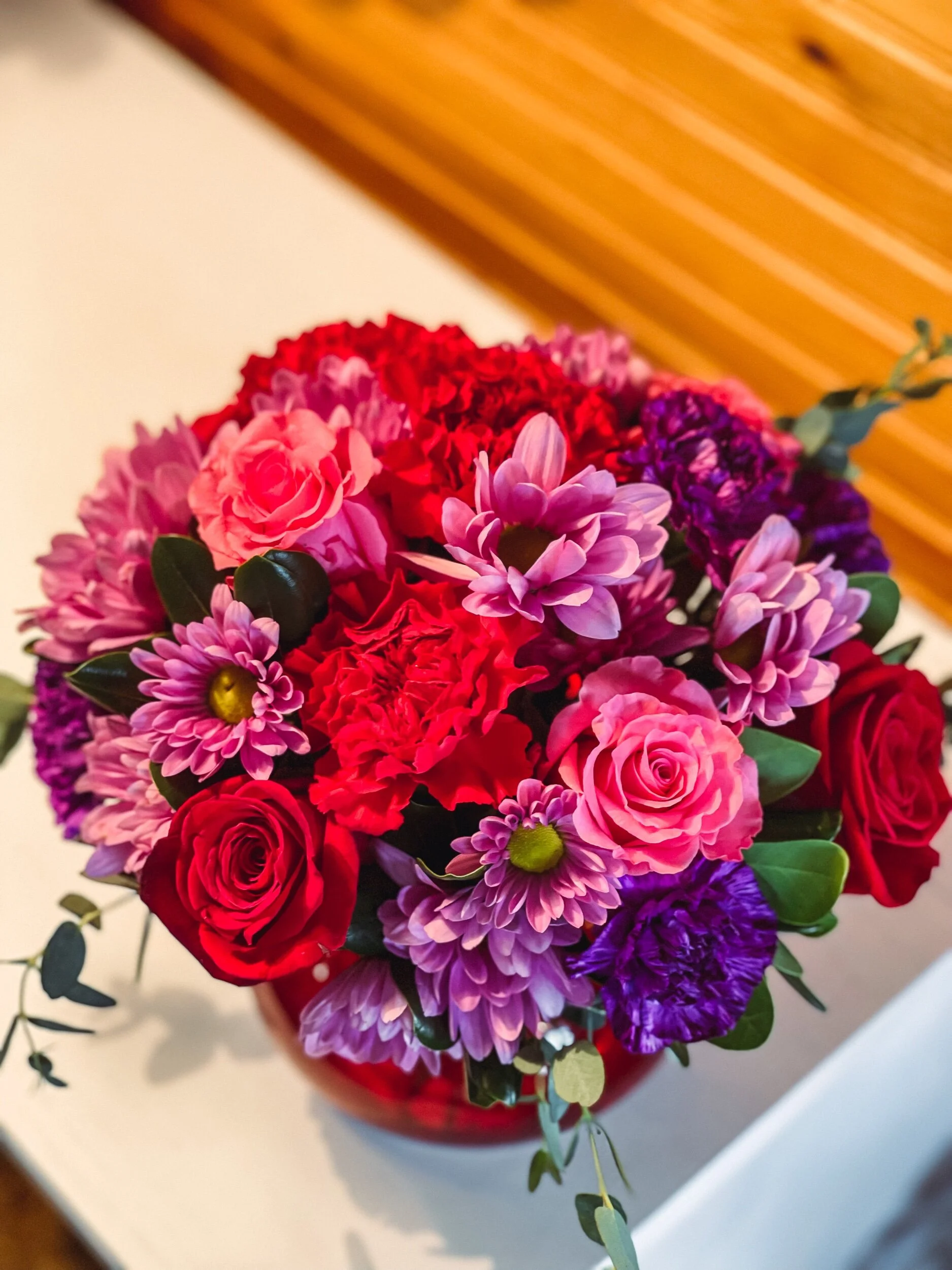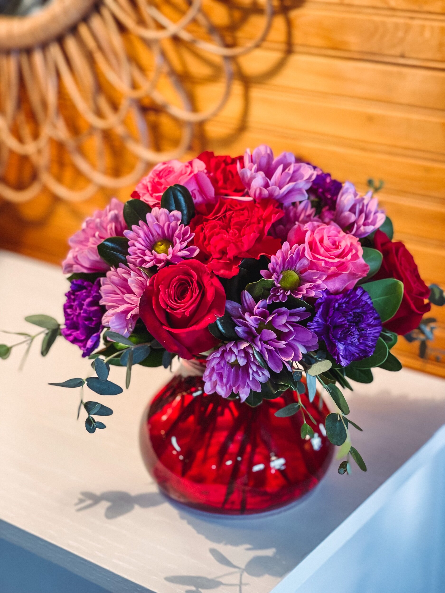 Will make arrangement as close to pictured as possible, but some substitutions may apply to flowers or vase depending on product available that week.