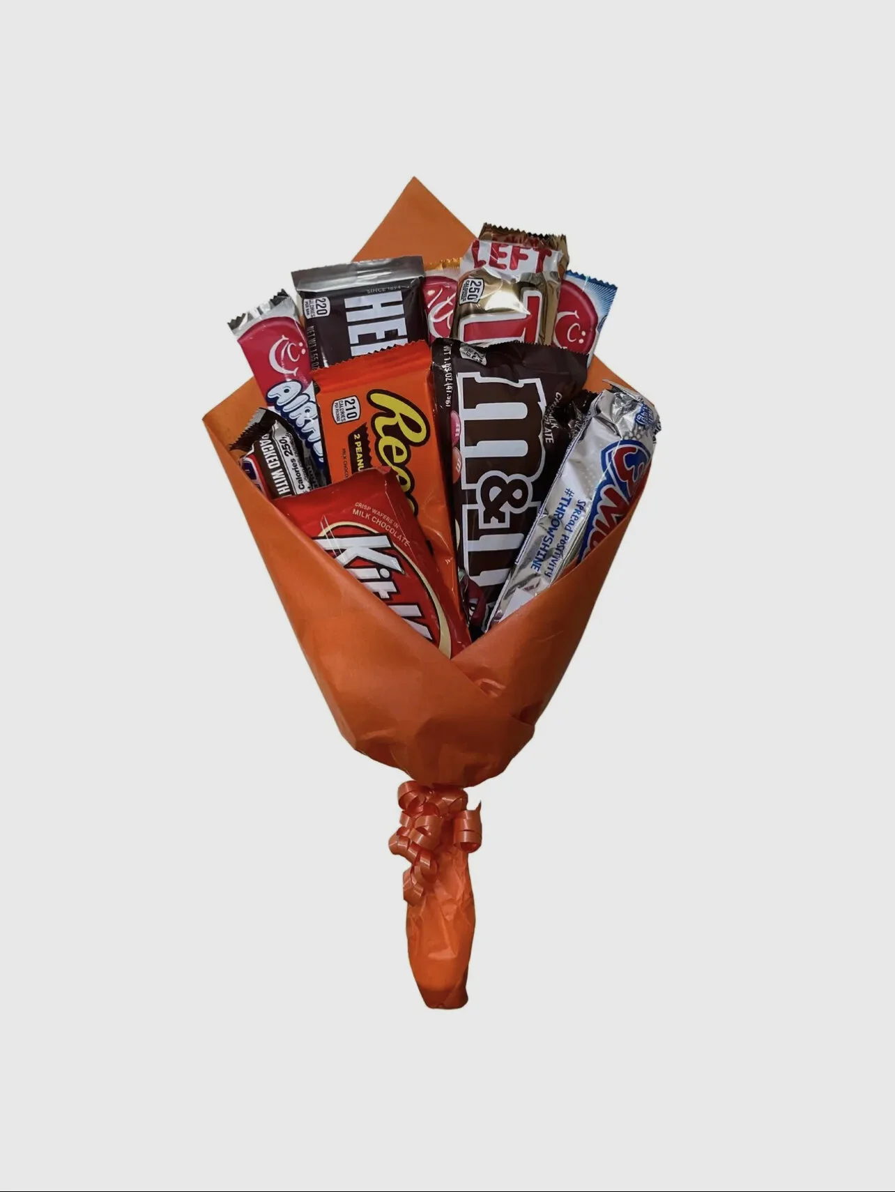A chocolate candy bouquet full of 11 delicious full size chocolate candies. Tissue paper comes in hot pink or blue. Please specify in the note section at checkout, otherwise we will choose for you.