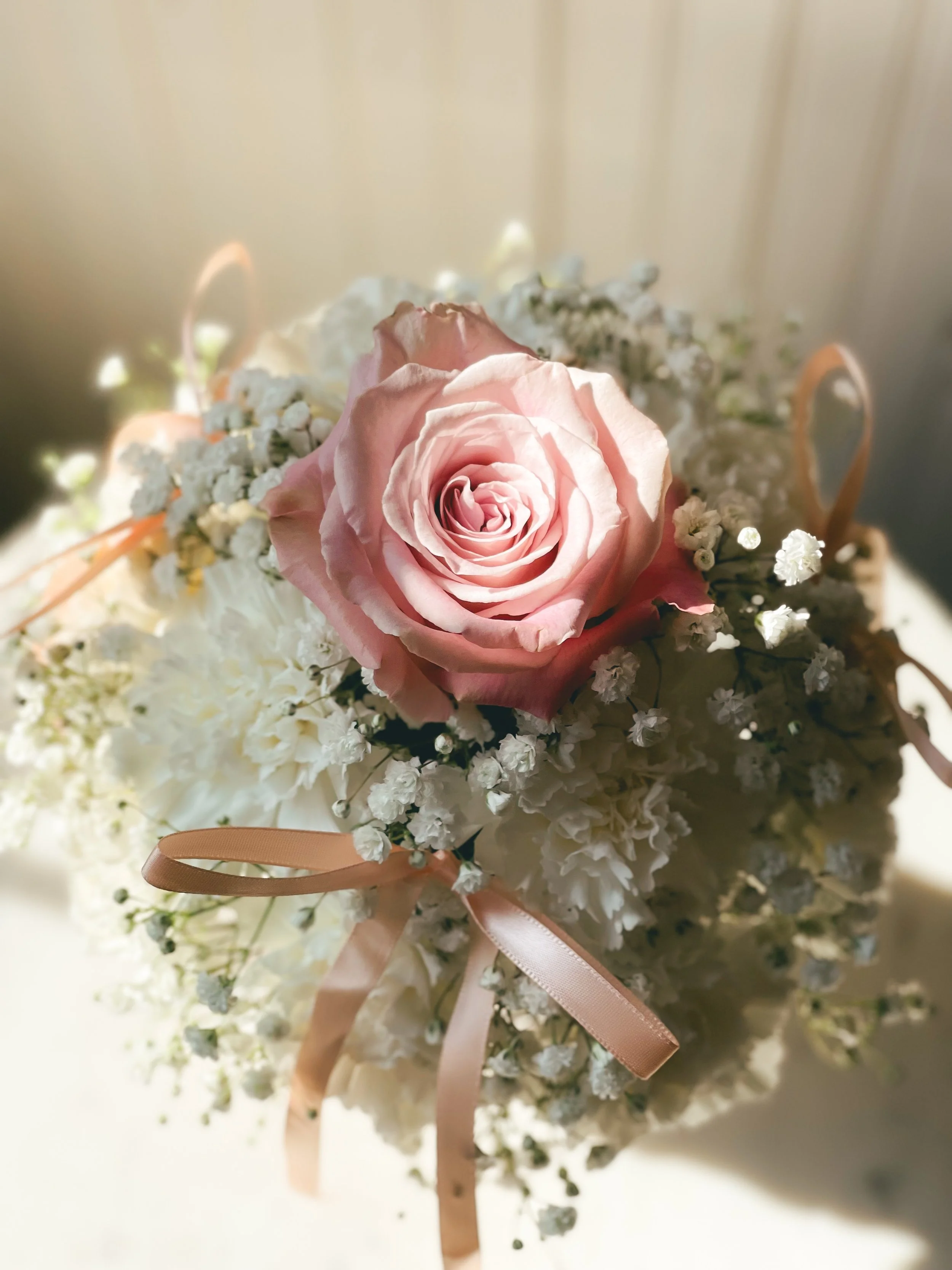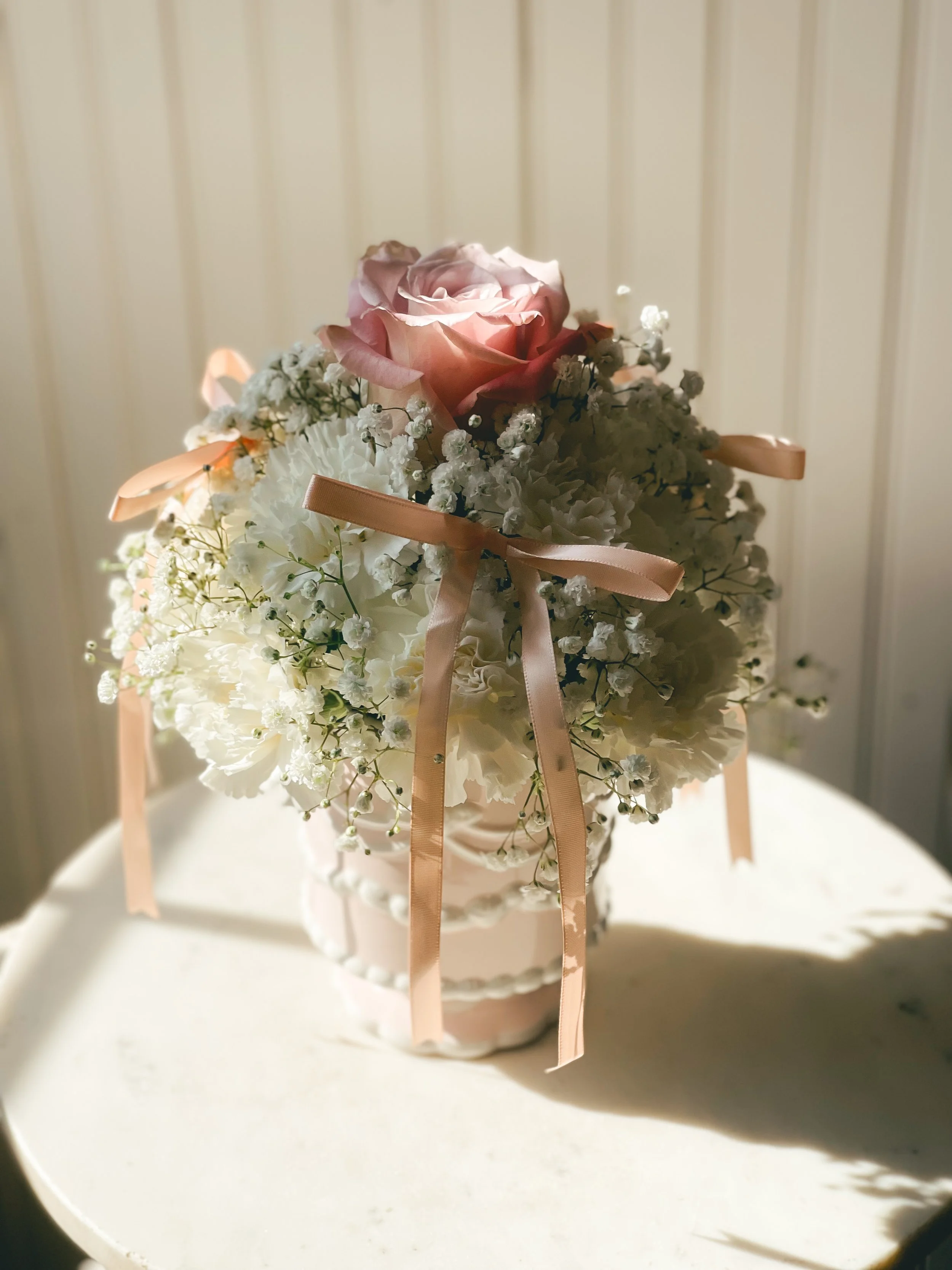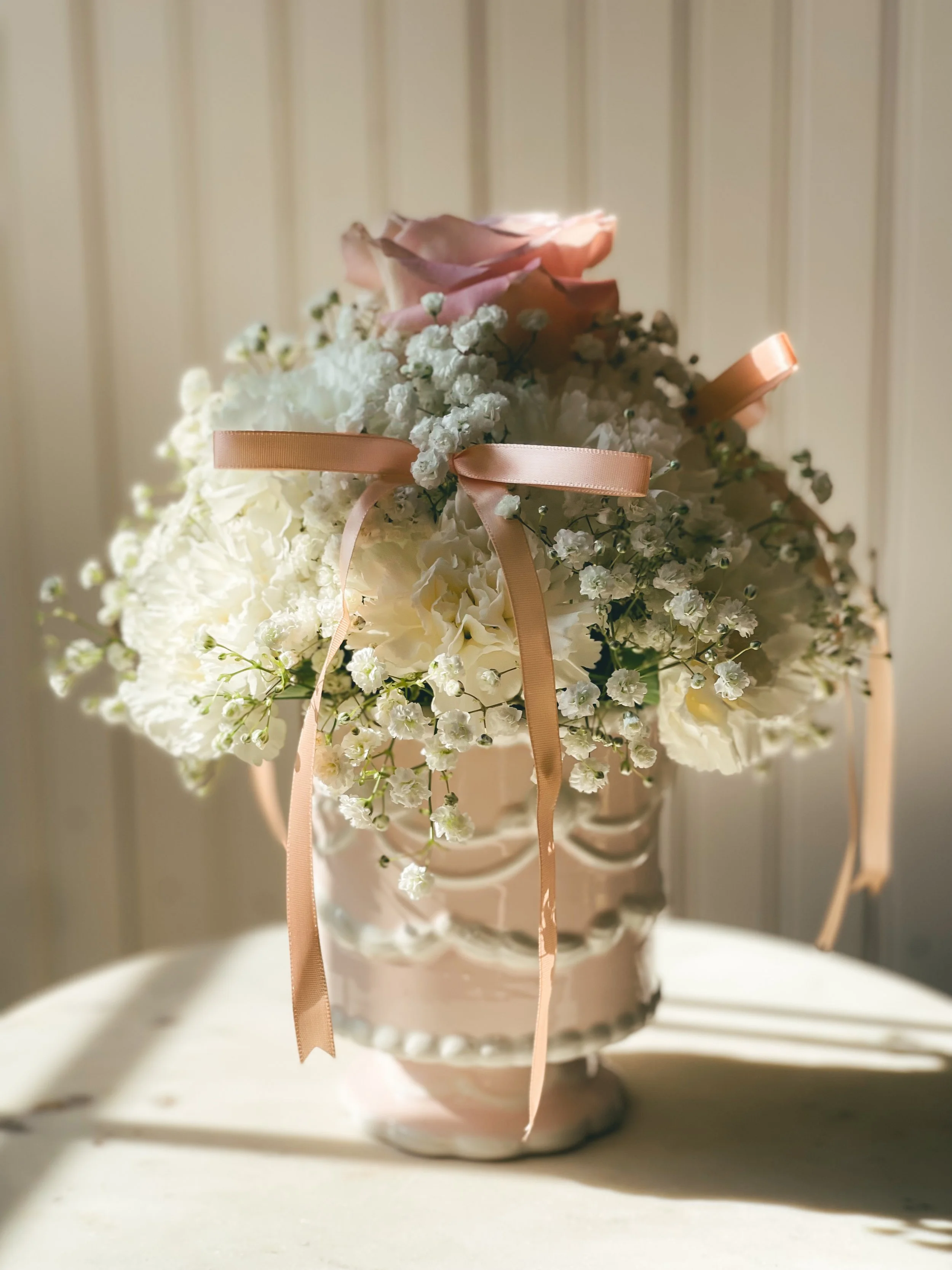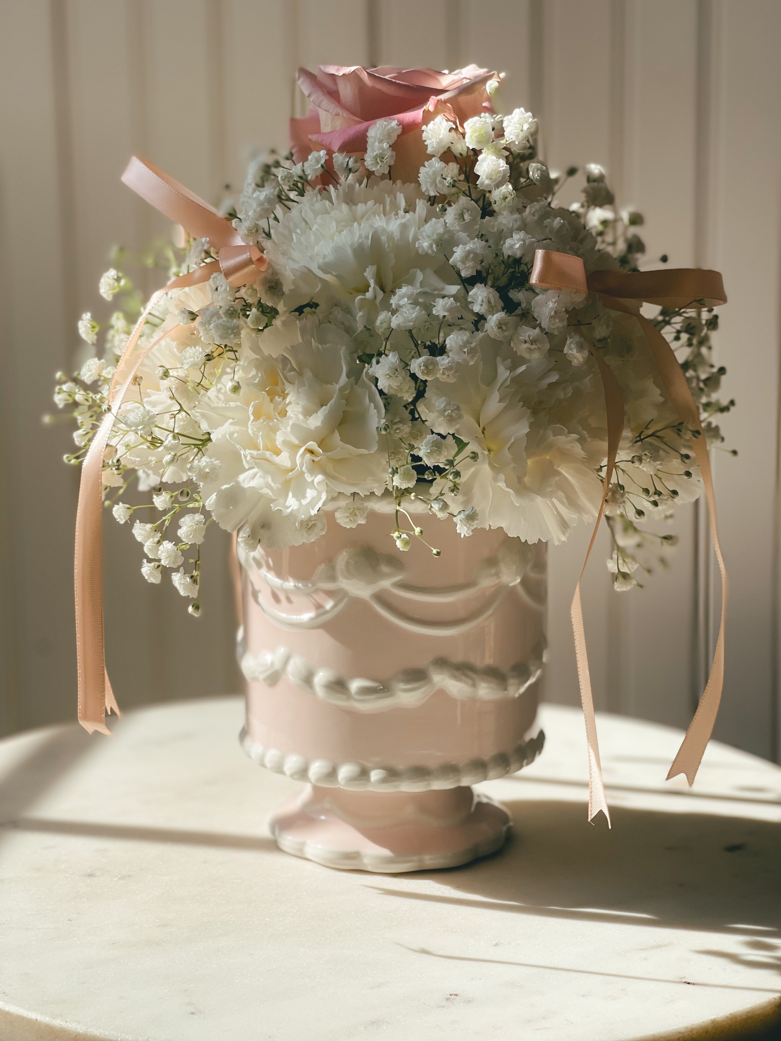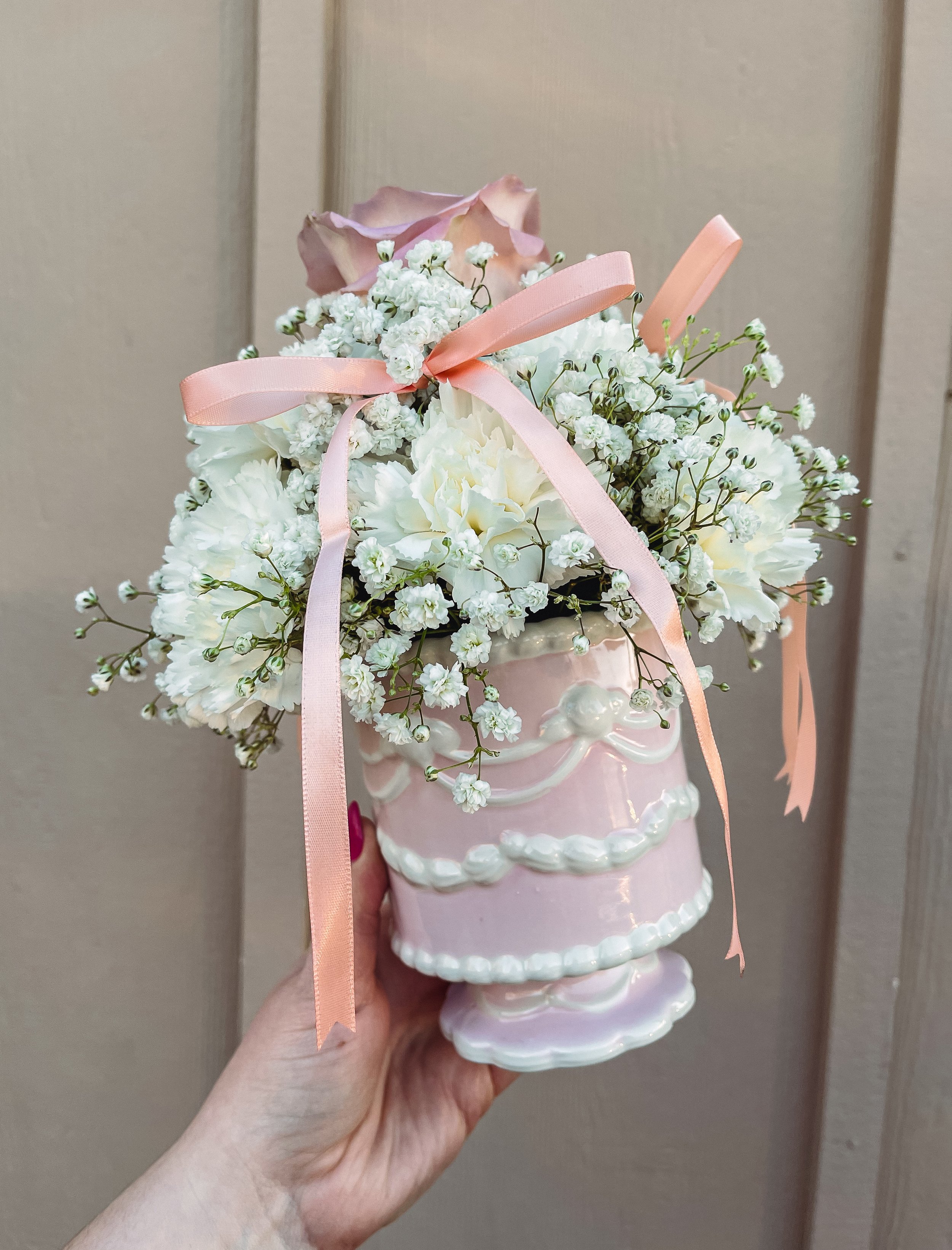 Cupid made a cake just for your Valentine. Floral arrangement in a vintage inspired cake container topped with sweet little bows.